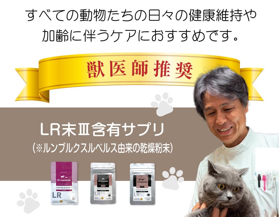 当ショップでは、LR末Ⅲ(ミミズ乾燥粉末) を含有するサプリメントを中心に、すべての動物(犬、猫、小鳥、馬など)の全身の健康維持をサポートする商品を取り扱っています。ドクターママルシリーズは、全国動物病院で取り扱われている、「ルンワン粒」「ルンニャンジンケア」「ジョイワン」の一般向け商品です。