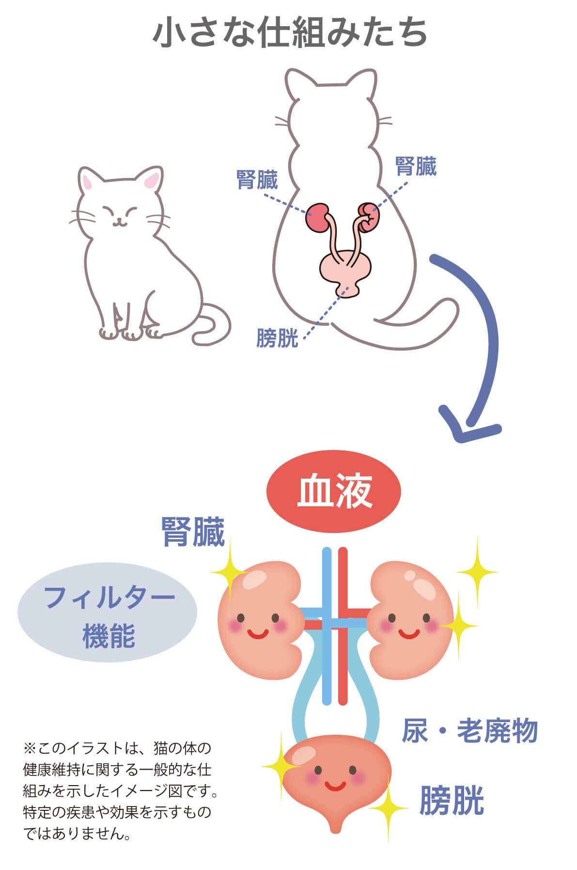 ねこちゃんの体の中では、水分やいらなくなったものを調整して、体内環境を安定に保つための重要なしくみが働いています。この機能がスムーズに働くことで、ねこちゃんの体調が整い、健康が支えられています。体の中にはこのように水分や老廃物のバランスを保つはたらきを持つ臓器(腎臓)があります。(下図参照)